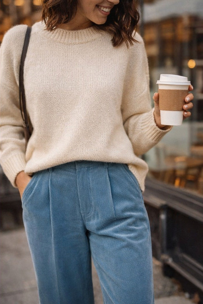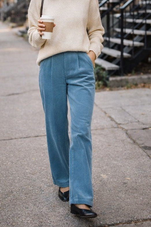 Sa teinte bleu doux évoque une touche vintage et se marie à merveille avec un pull crème, un haut ajusté ou une chemise oversize. Grâce à sa composition respirante et son élasticité subtile, ce pantalon offre un confort exceptionnel tout au long de la journée.