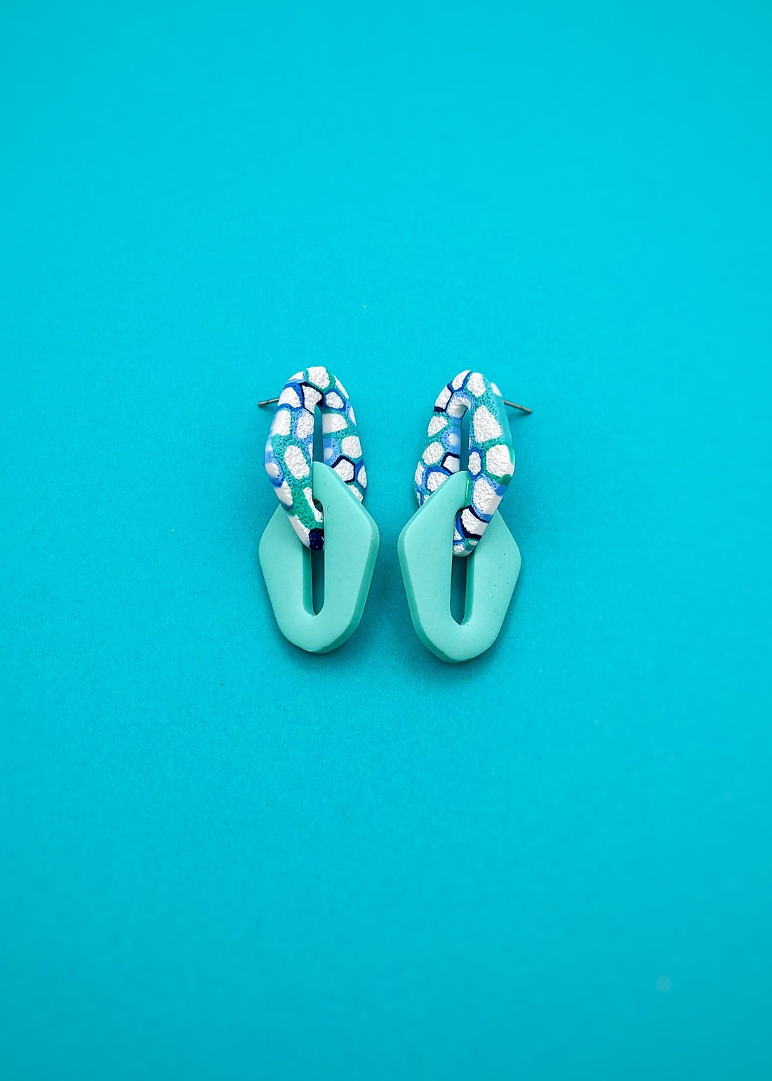 Série de boucles d'oreilles ultra funky et audacieuse aux tonalités froides. Cette collection marie des tons de bleu cobalt, turquoise, blanc et vert menthe, avec des motifs abstraits façon mosaïque et des formes inspirées des années 80-90.